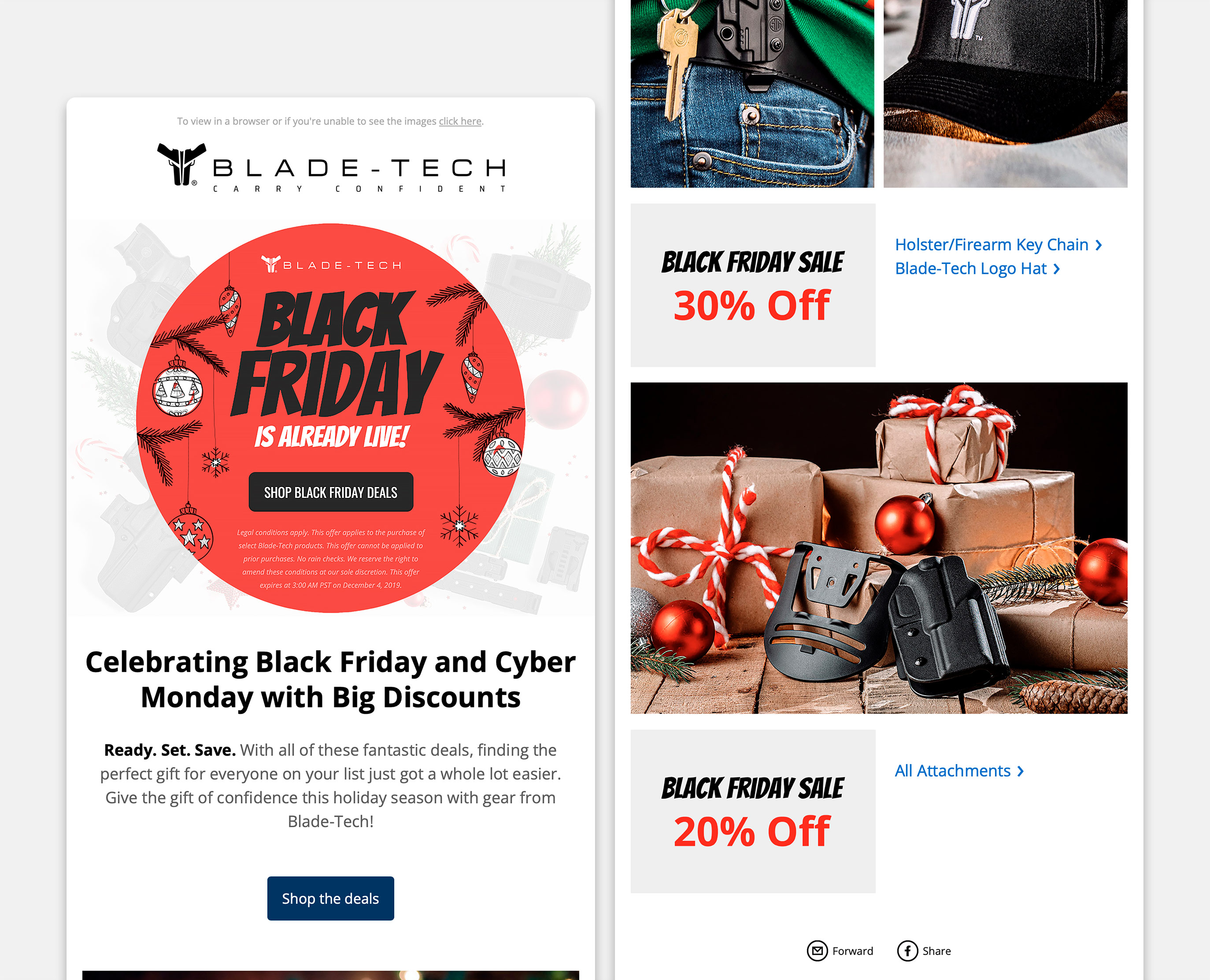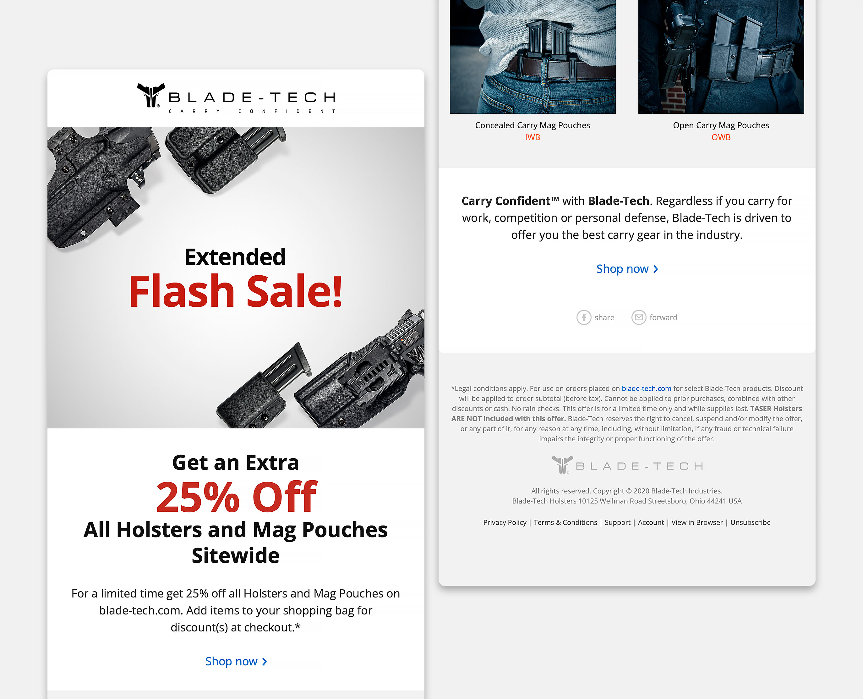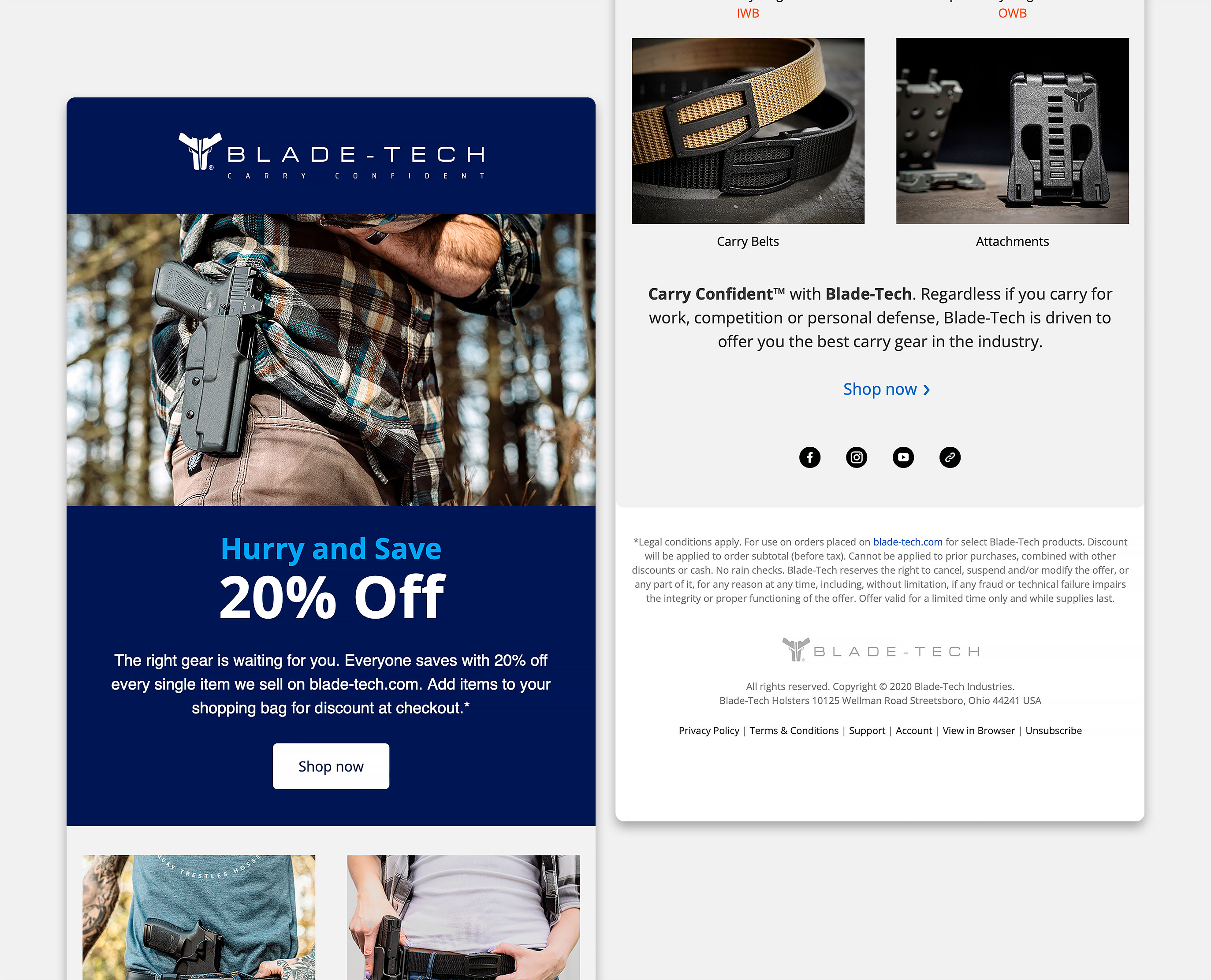 Blade-Tech Industries, based in the Cleveland metropolitan area, is a global manufacturer of carry gear for civilian, military, and law enforcement markets. The company requested targeted, offer-based email campaigns and responsive email templates that would help drive traffic to their eCommerce store.