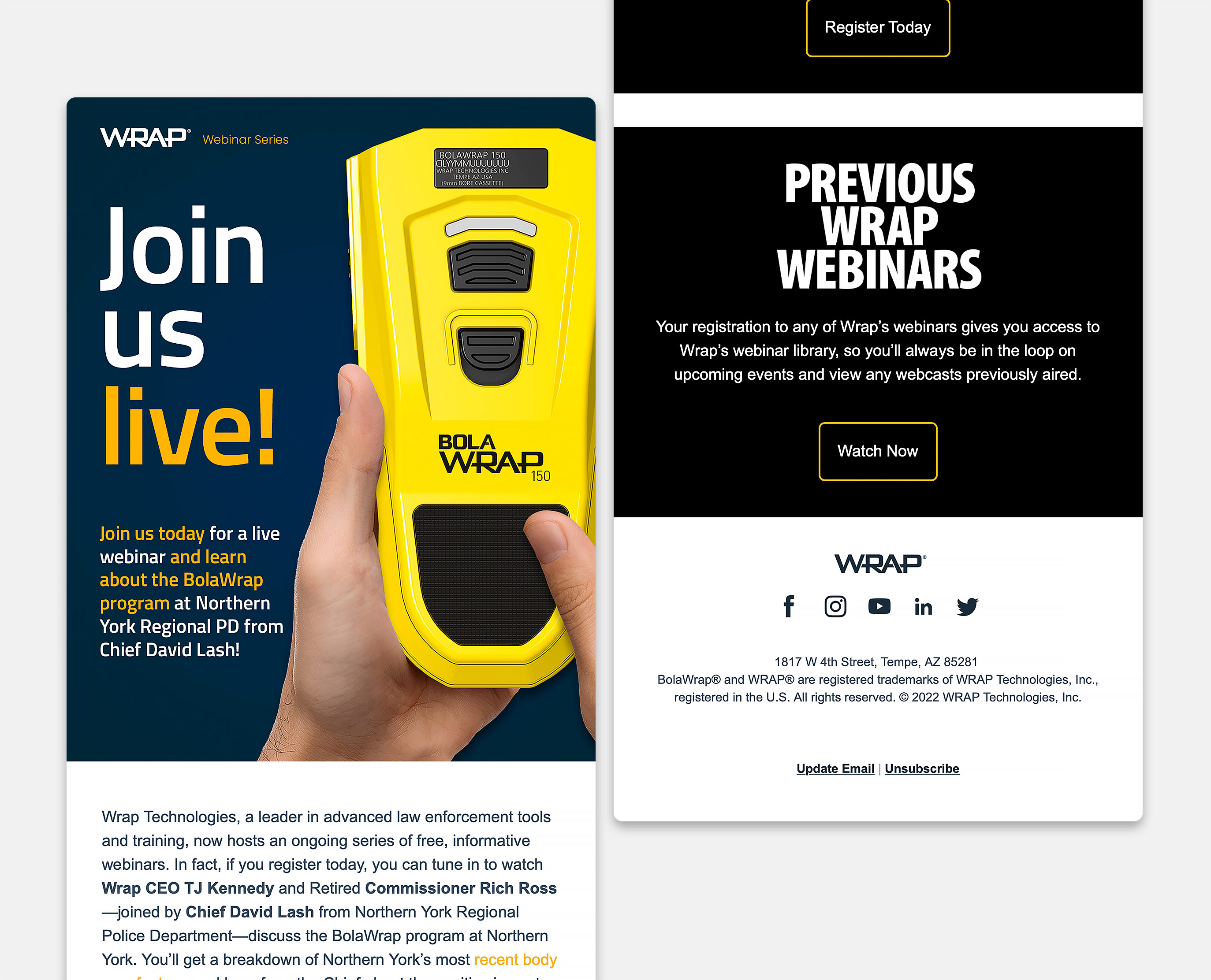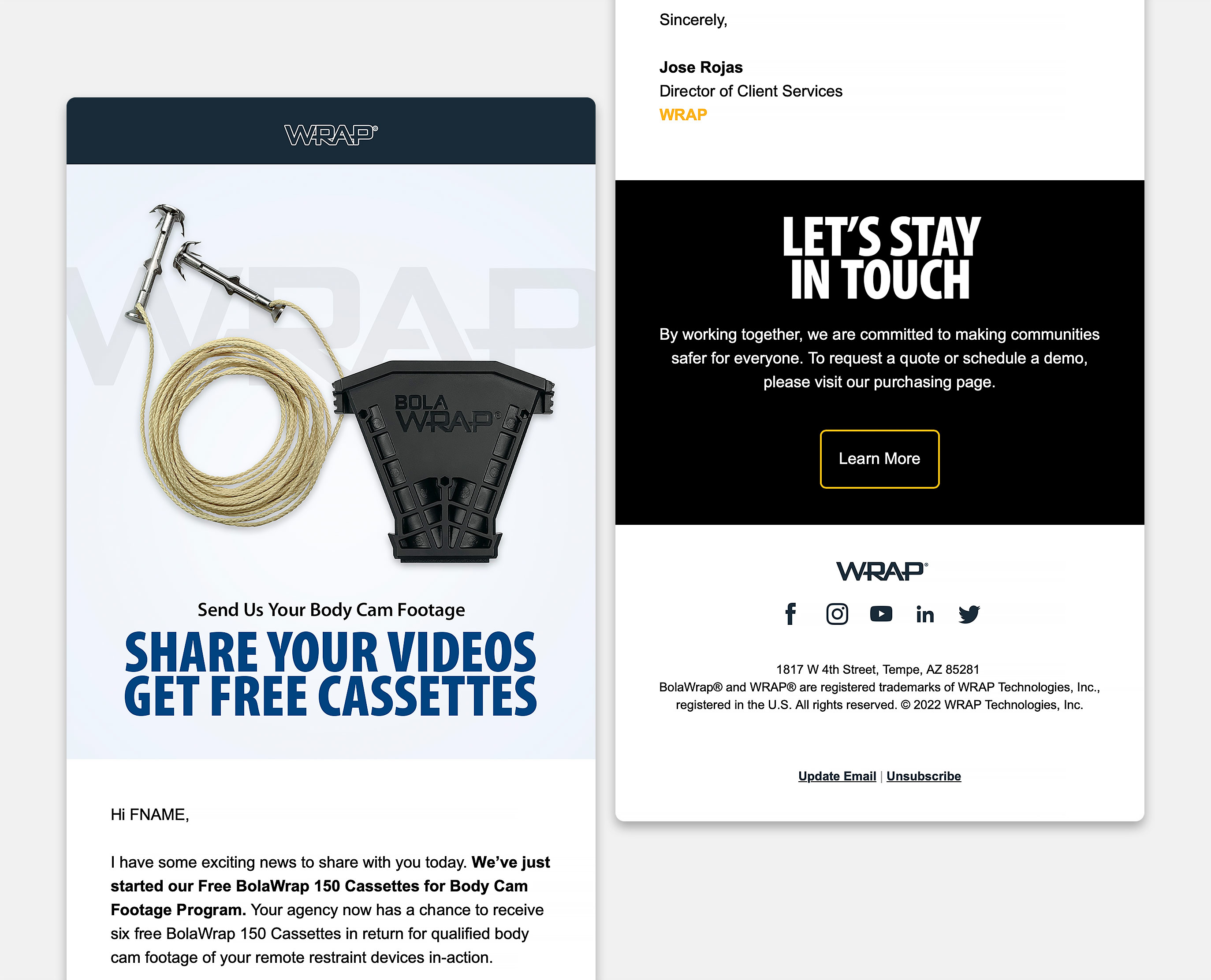 WRAP Technologies is based in the Phoenix metropolitan area and is a global leader in innovative public safety technologies and services. The company requested targeted, offer-based email campaigns and responsive email templates. WRAP wanted to convert their contacts to leads and eventually sales revenue using the Zoho CRM platform.
