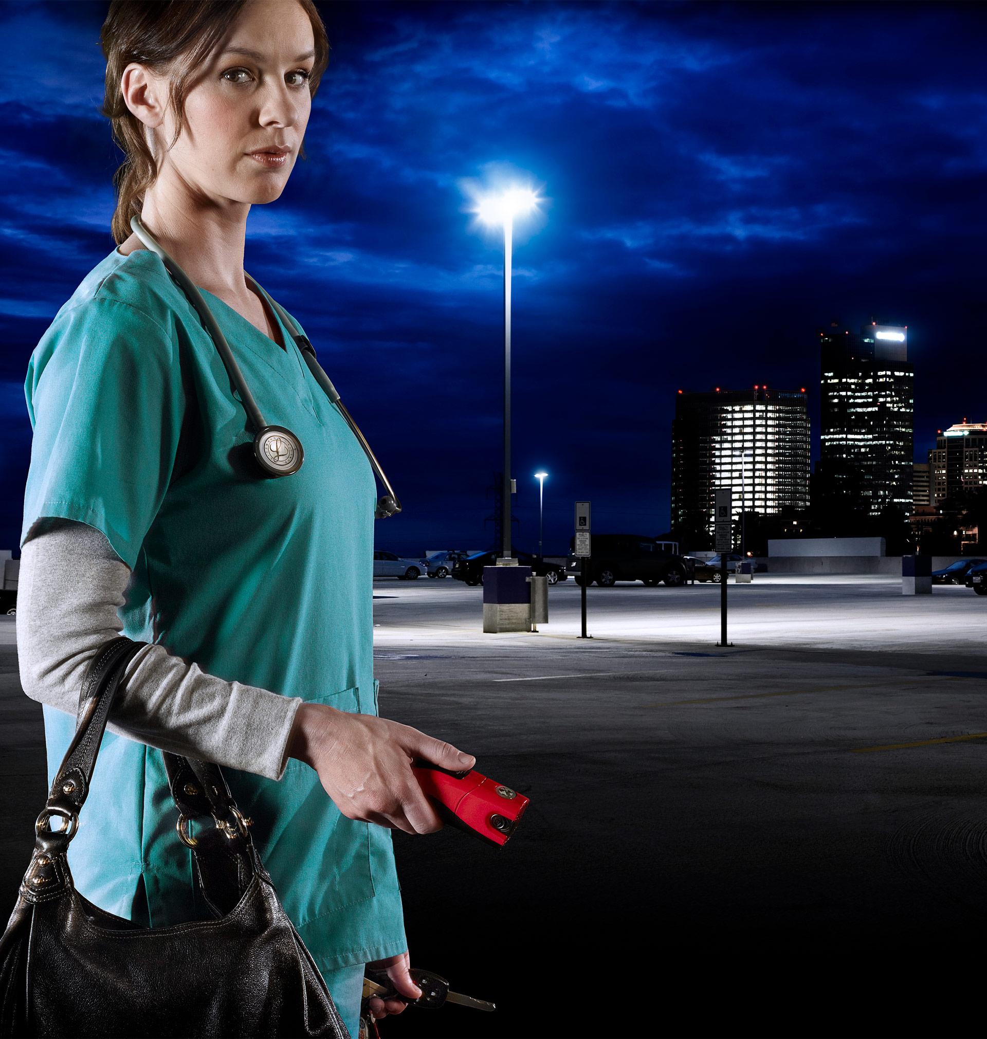 Based on the company’s objectives, I utilized a commercial photographer to capture the model during an outdoor photoshoot. I produced the final composite imagery. The goal was to tell the story of a young nurse walking to her vehicle after a long day at work. The image conveyed a feeling of protection, strength, safety, and self-confidence.