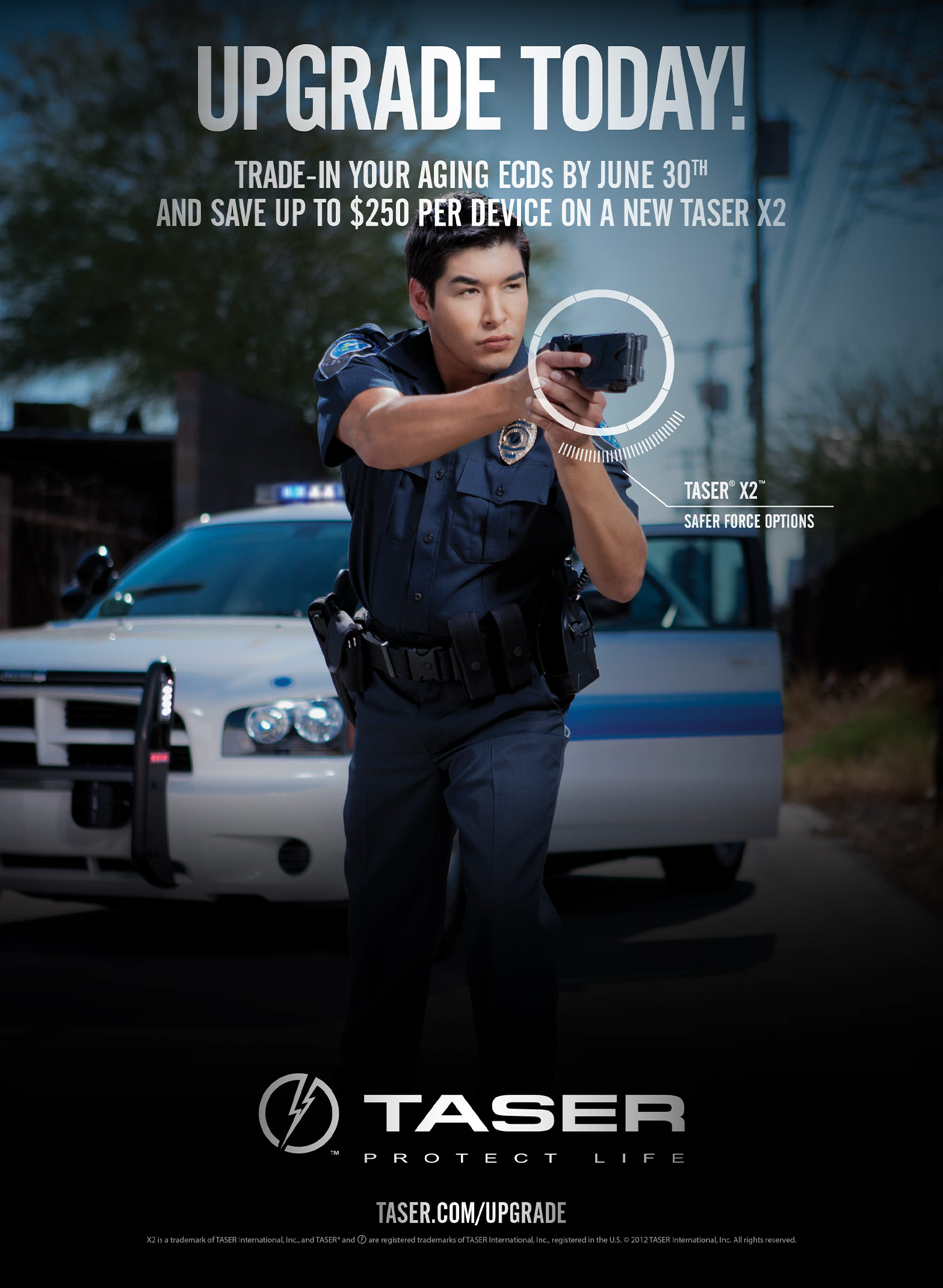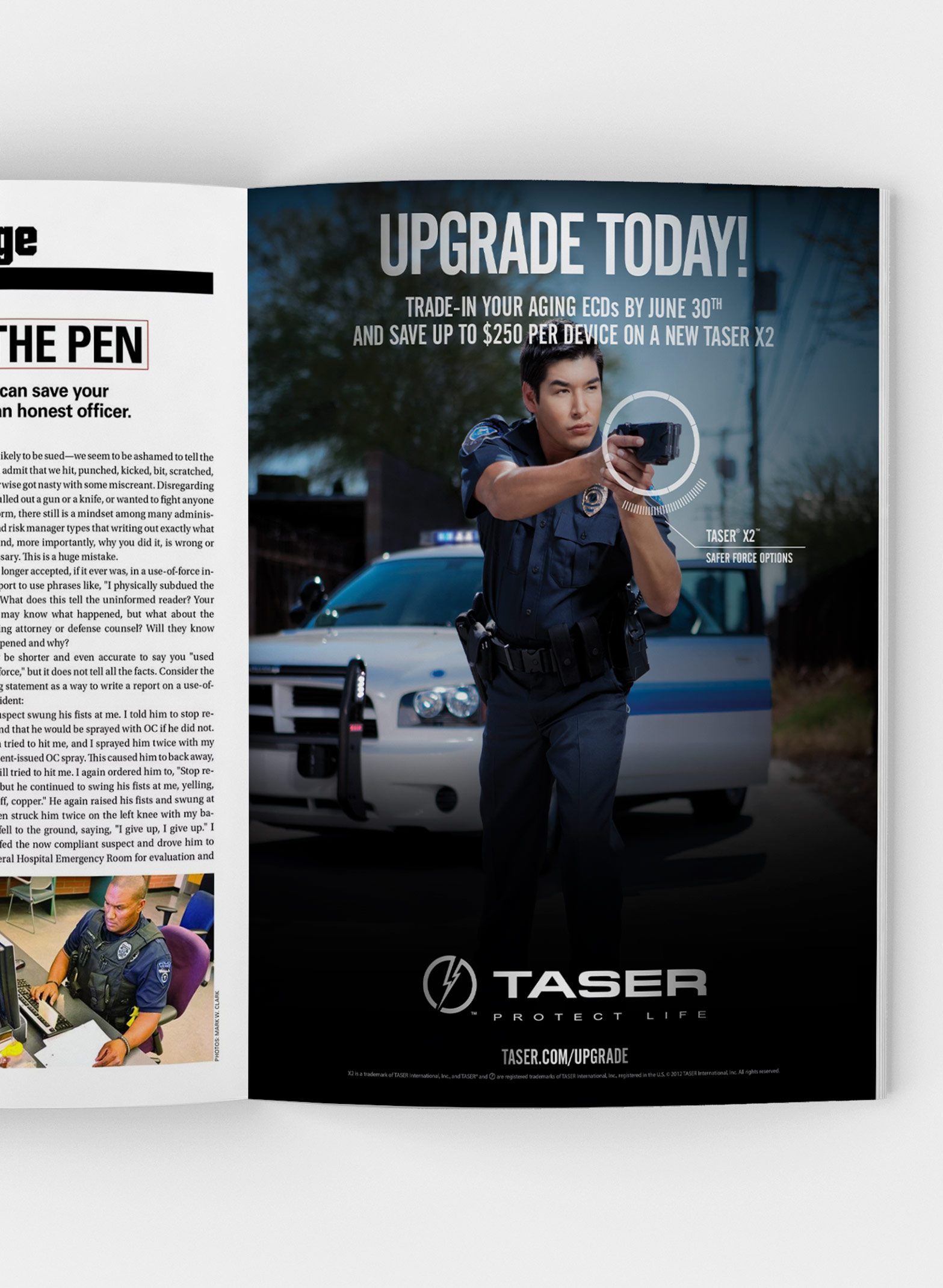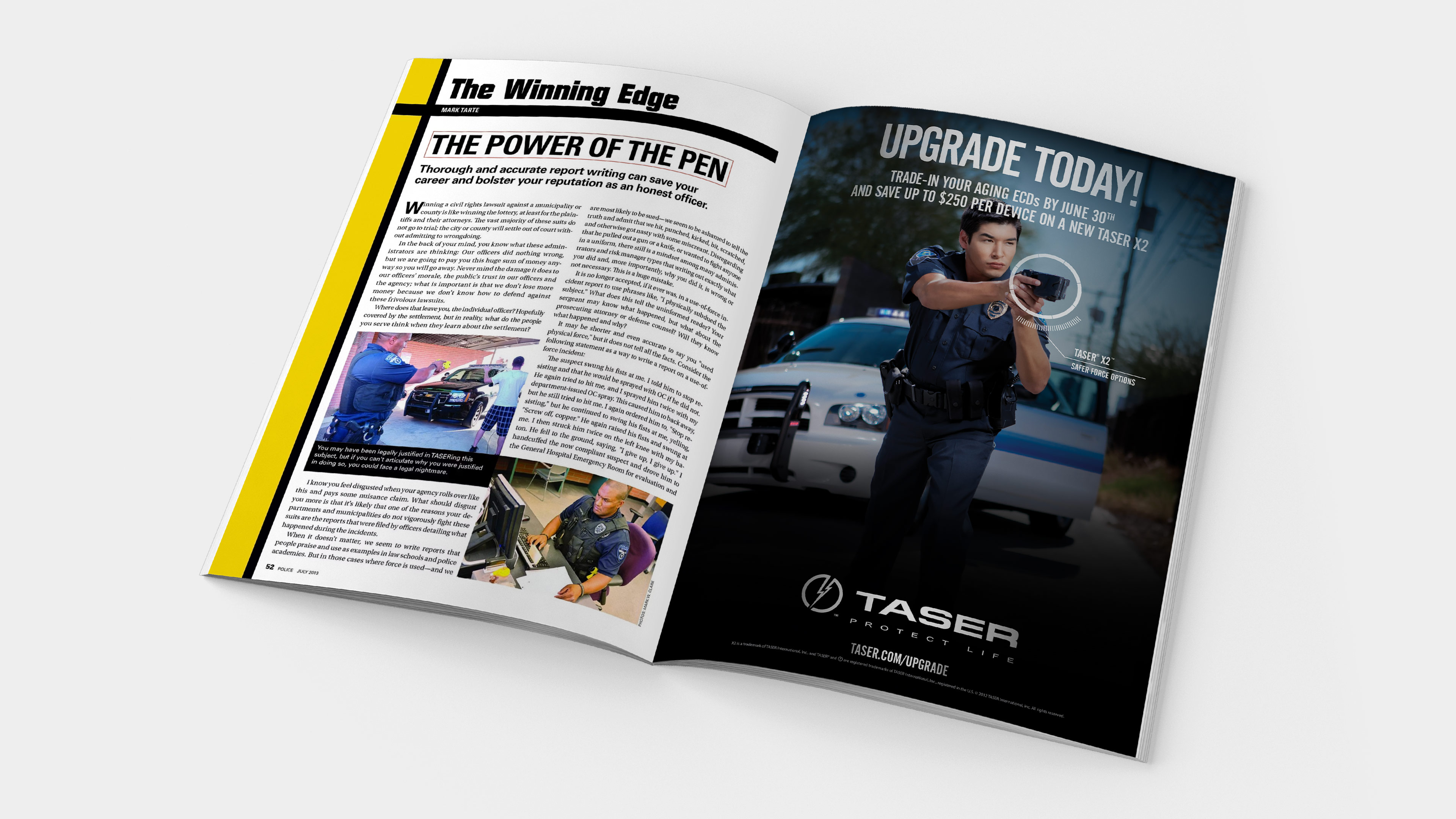 Abiding by TASER's brand standards, I created a 4-color print ad. The creative conveyed an edgy, dramatic, emotional ad with a rookie cop in a hero role showcasing the new TASER X2 device. This ad helped drive awareness, leads, and ultimately new business and revenue.