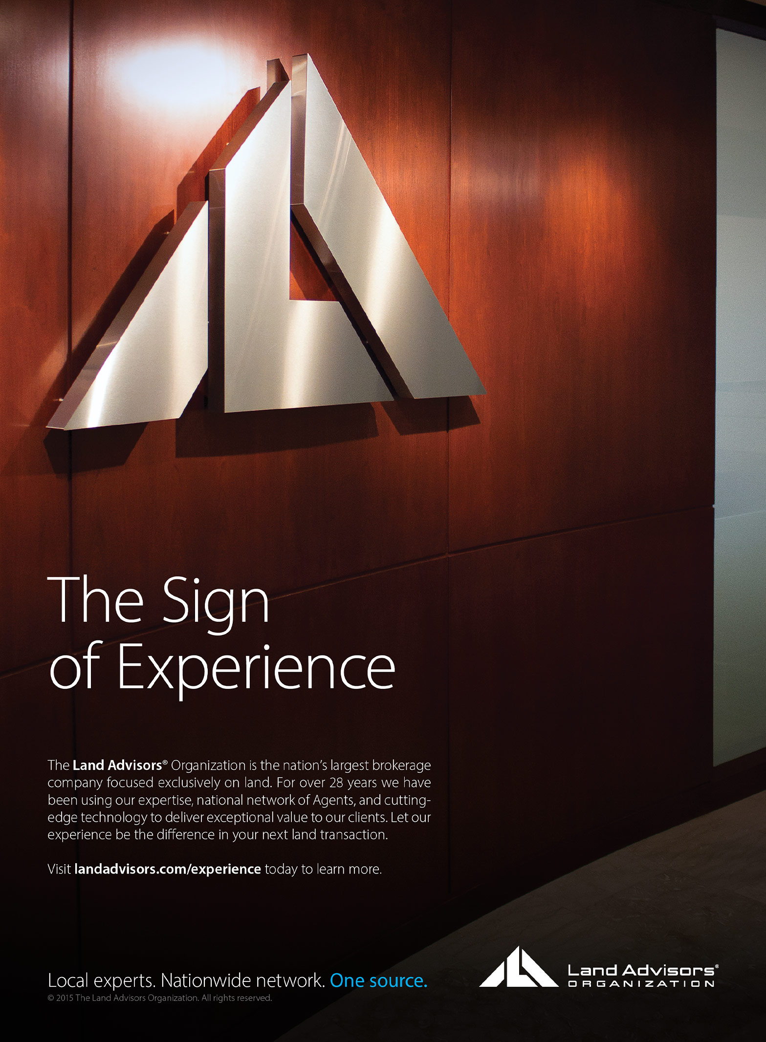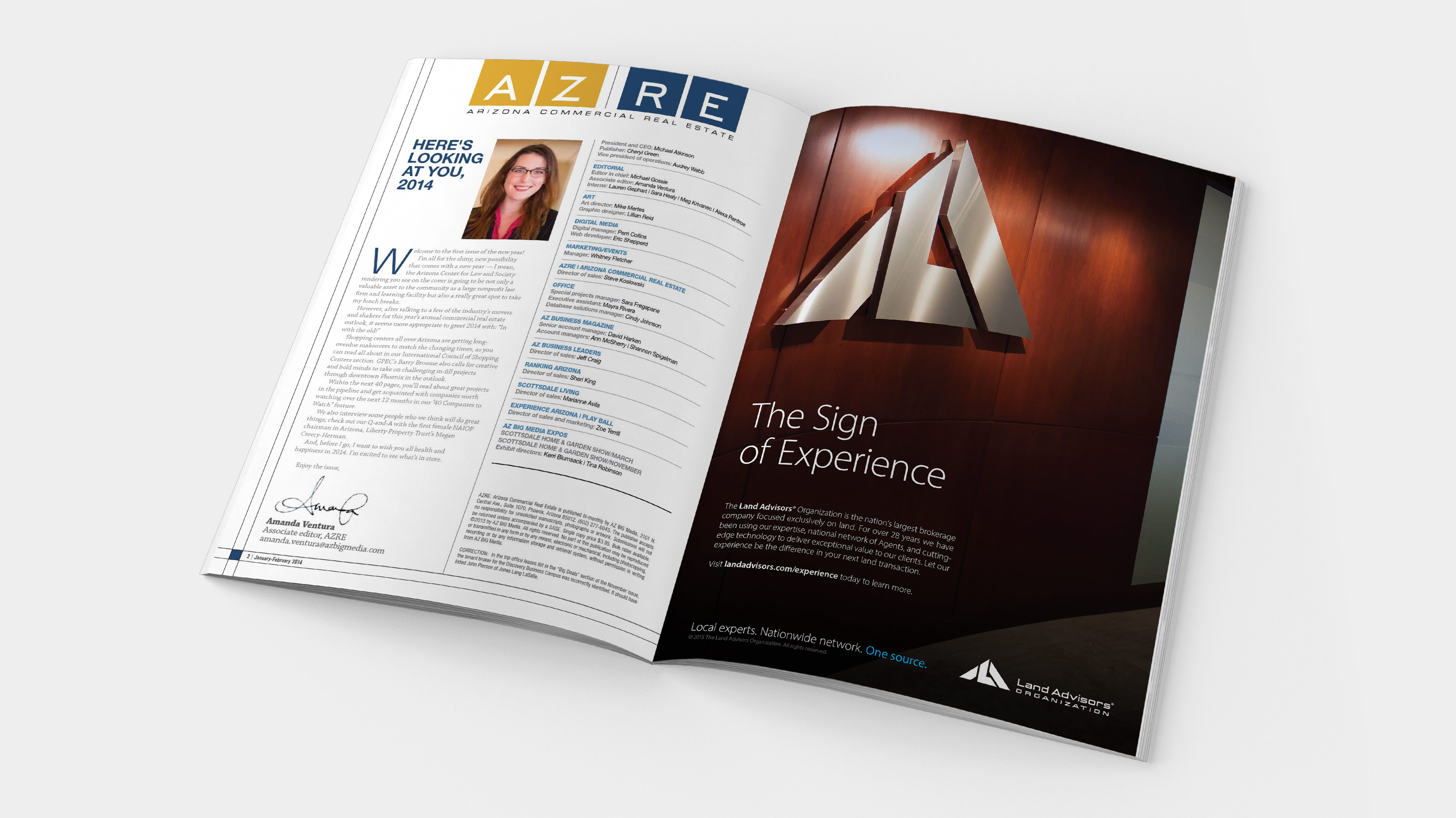 The Land Advisors Organization, based in Scottsdale, is America's largest brokerage firm focused exclusively on land. The company required a full-page print ad for AZRE Magazine. The goal was to play off the Sign of Experience title and the Land Advisors Organization's sign.