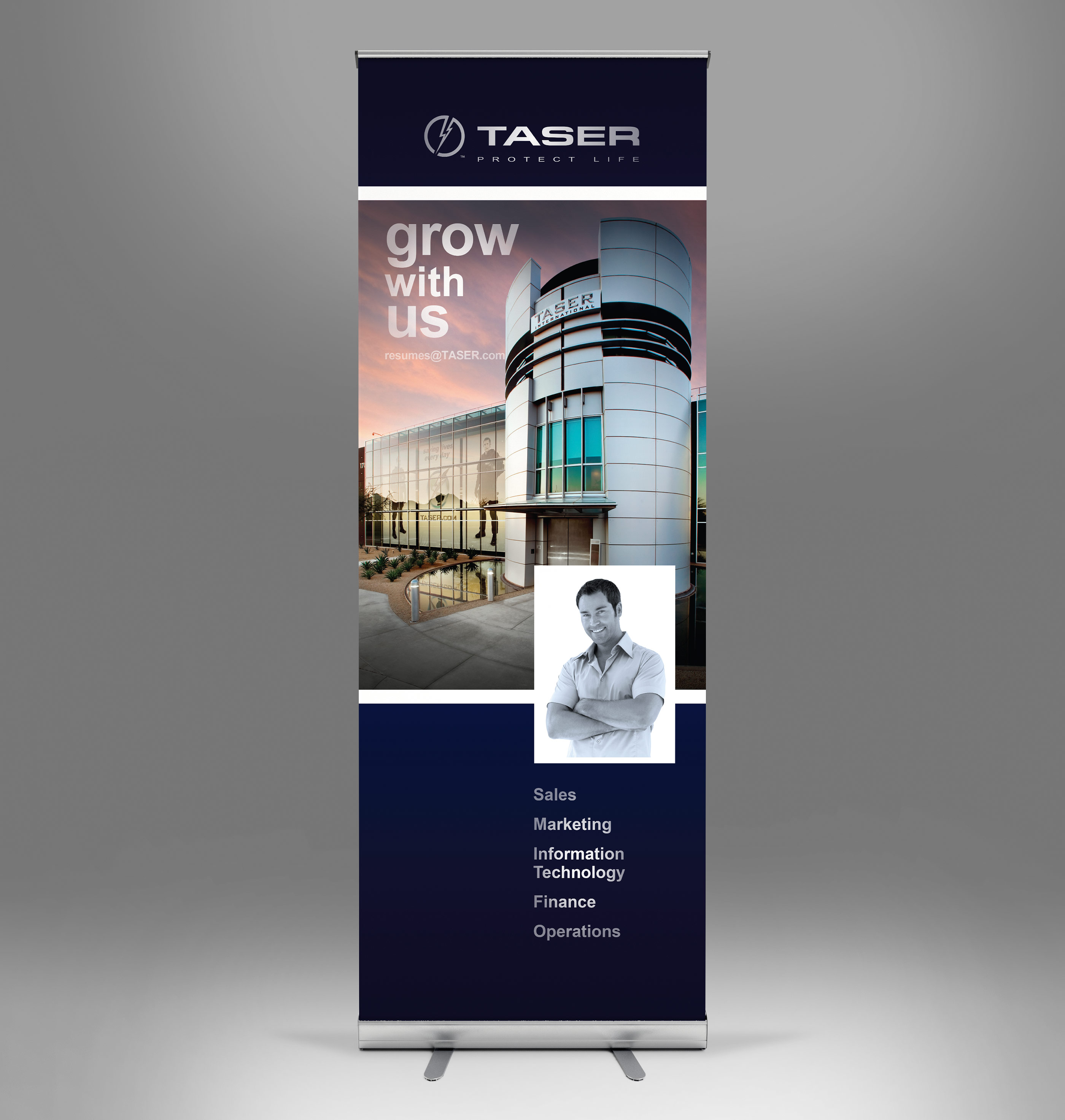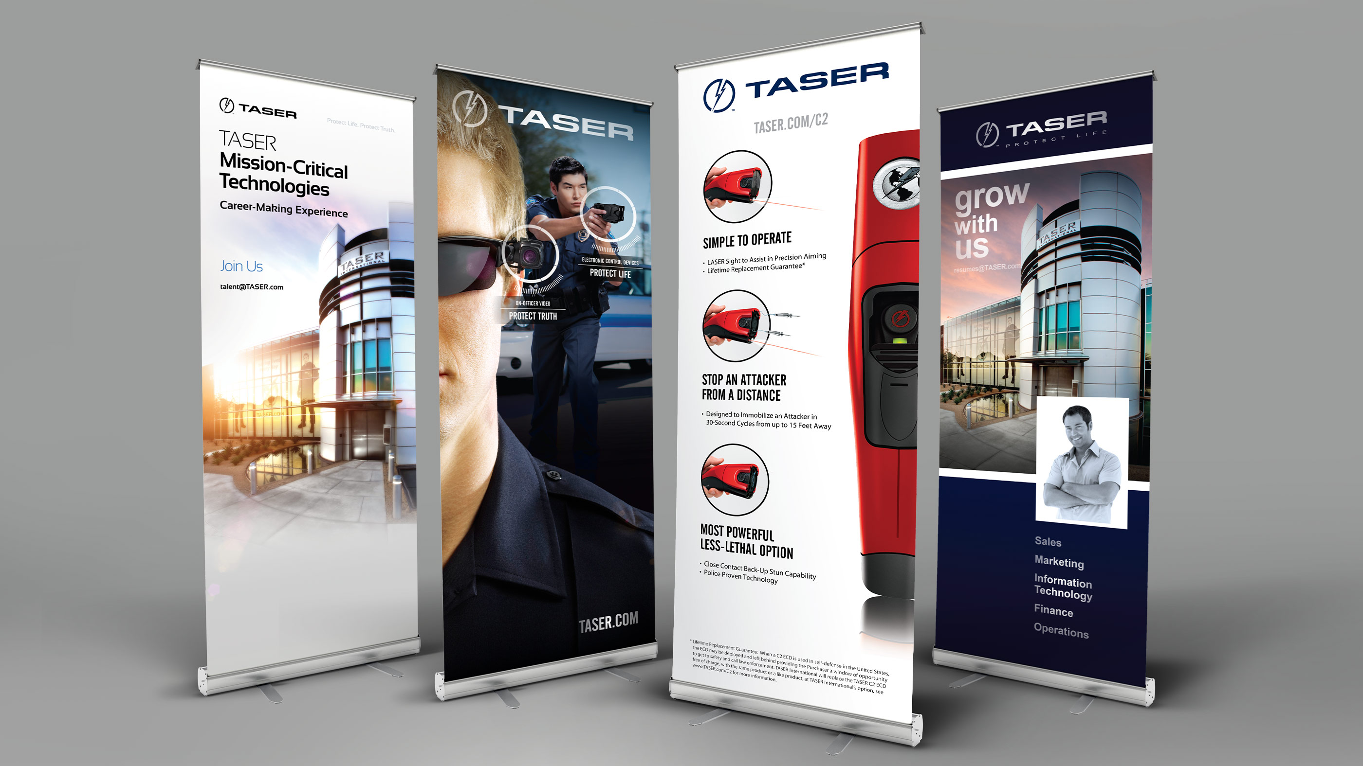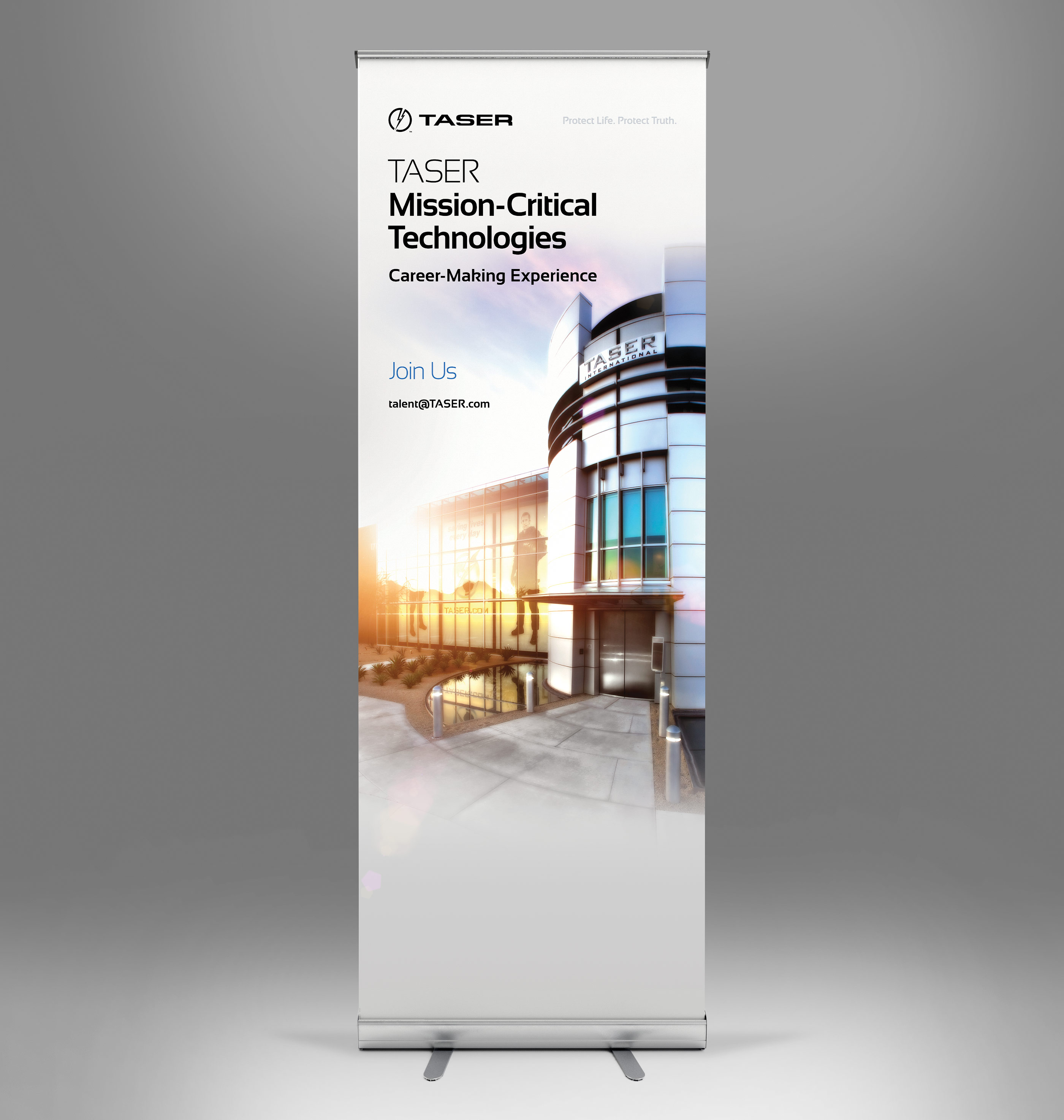 Staying true to the company’s brand standards, the banner stands have layouts that are simple, and clean and represent the essence of the TASER brand. These portable, large-format banner stands were used to promote both B2B and B2C company products as well as the company hiring events.